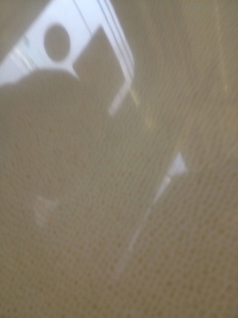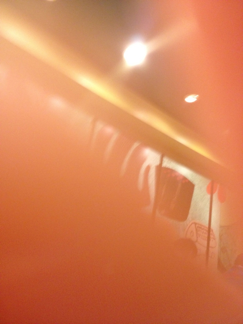 乗っていた電車の壁に、両開きドアの窓の外からの光が写っています。記憶の彼方のぼんやりした光にも見えます。
