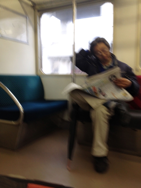何となくおかしかったので。電車の中です。おじさんのポーズにしびれます。