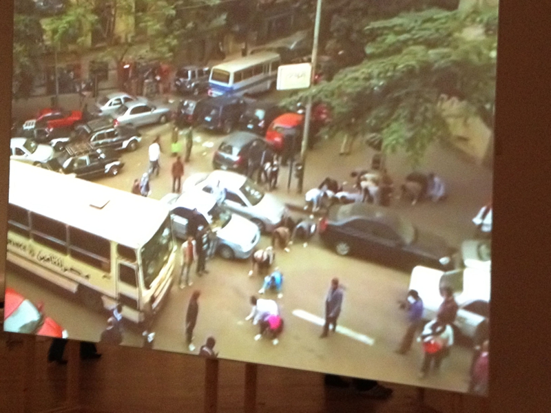 エジプトの人って、こんなこともするの?と、ちょっとびっくりした作品。映像作品ですが(スクリーンをちょっと斜めから撮ったので見にくいですね)突然右斜め上の建物の入口から四つん這いの男たちの列が、道路を横切って行きます。「硬直化した社会と権力の理不尽さ」を描いているそうで、ケナーウィさんはこれが原因で警察に捕まり三日ほど拘束されたそうです。やっぱり体を張ってたんですねえ。