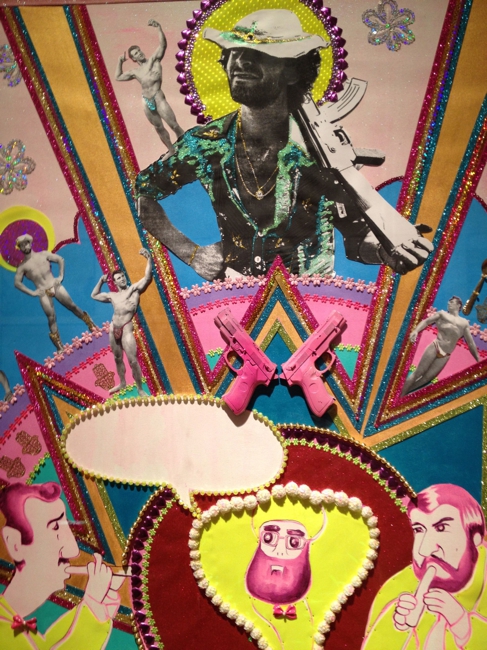 ふふっ、これは面白いコラージュですね。かなりおちゃらけた感じで、パンツ一枚ムキムキの男性の写真やピンクのピストルなどが貼ってあるし、こんなことして大丈夫なの?と思いましたが、かなり強烈な風刺のようですね。