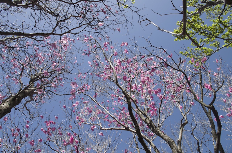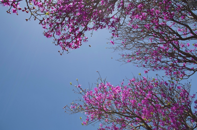 わずかな日陰を作っていたミツバツツジの花の下でお弁当を食べました。